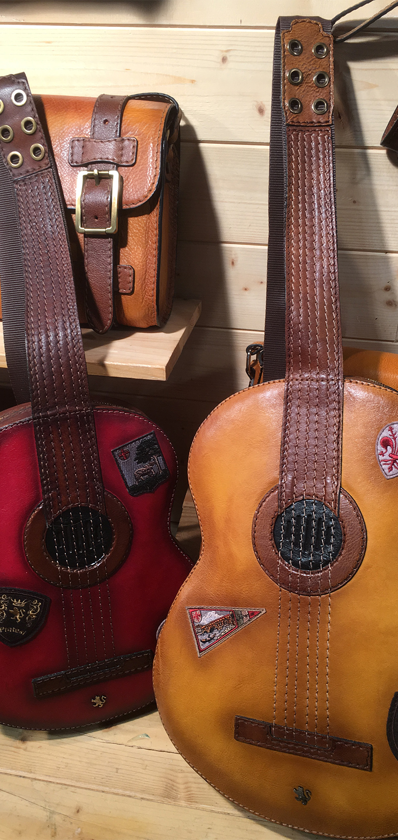 個人的にはエッジが効いたアイテムが好きなので、本当は美術館の展示のような面白いバッグや靴をディスプレーしたい気持ちもあります。これまでにバイイングしたアイテムで面白かったのは、ギターの形をしたショルダーバッグです。ショルダーがギターのネックになっていて、ウォシュドレザーでイタリアの国旗やエンブレムがワッペンで縫いつけられています。バッグの中には、LEDライトとスマホなどがつなげられるスピーカーも付いていました。同じブランドのカメラ型のバックと一緒にディスプレーすると、他のお店では見かけない光景でユニークな雰囲気でした。音楽好きなお客さまやイタリア好きのお客さまには大ヒットしましたね。私も買いたかったくらいのアイテムでした。